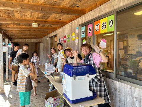 保護者会が子どもたちになつまつりを企画してくれました。みんなで簡単おにぎりをつくって、カキ氷、魚つり、うちわつくりを楽しみました。最後はお父さんお母さんもいっしょにみんなで盆踊りを楽しみました。