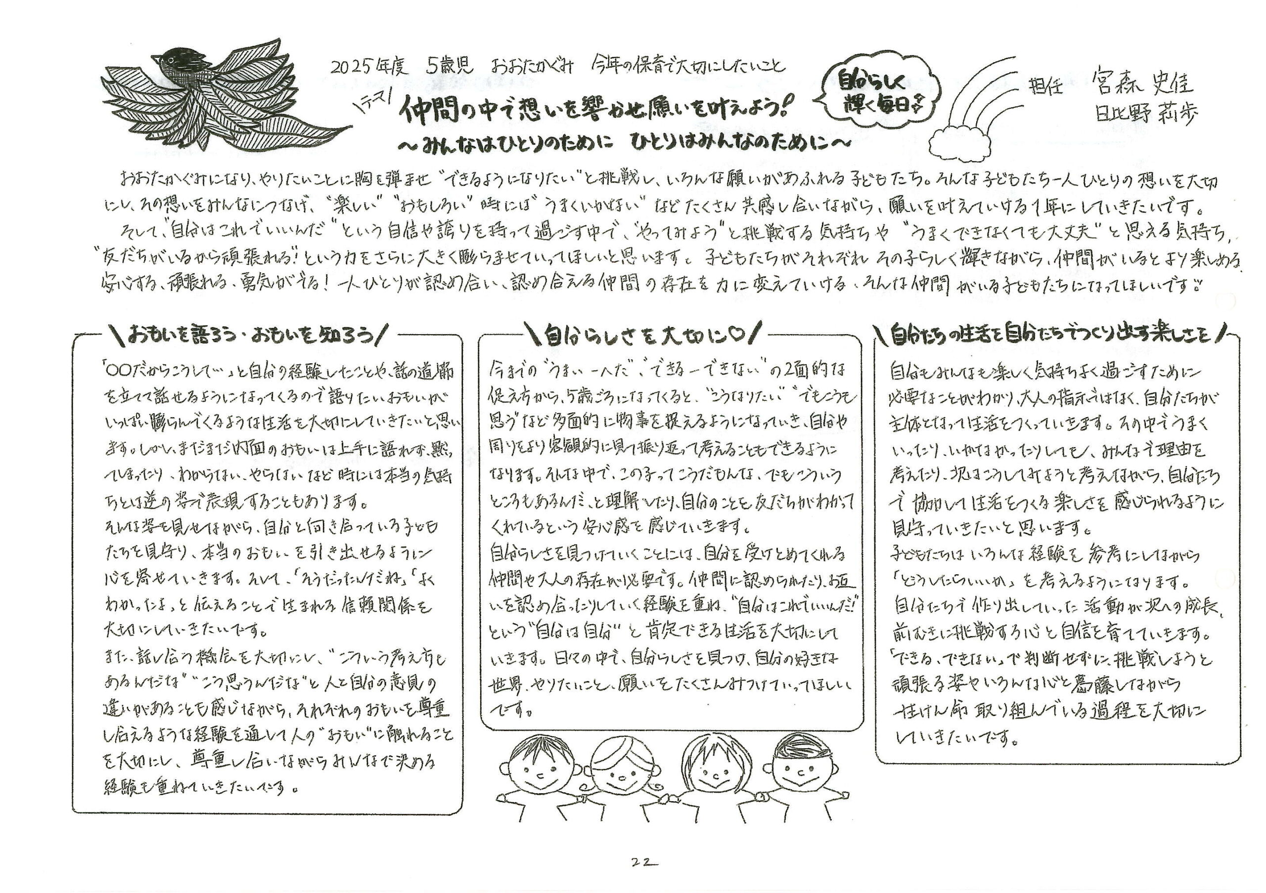ことり保育園のクラスはすべて鳥の名前です。赤ちゃんの「かるがも」さんは年長クラスの「おおたか」になって飛び立っていきます。